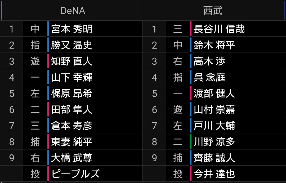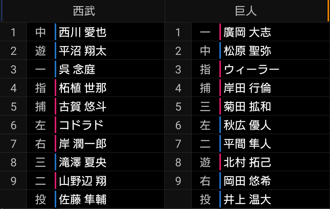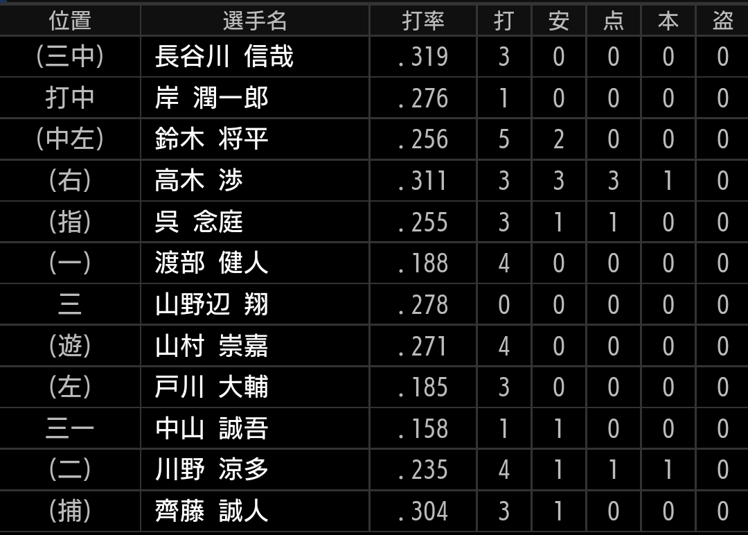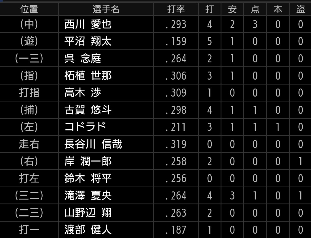 滝澤選手はこういう時こそ、本職のショートを守らせたかったですが、当面は内野ユーティリティーとして考えているようで、サードで出場です。西川選手は1軍ではなかなか結果を出せませんが、自分の打撃を見失わずに調整してもらいたいです。