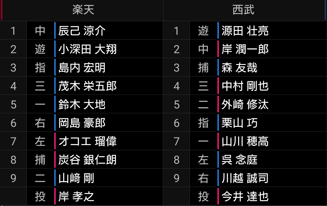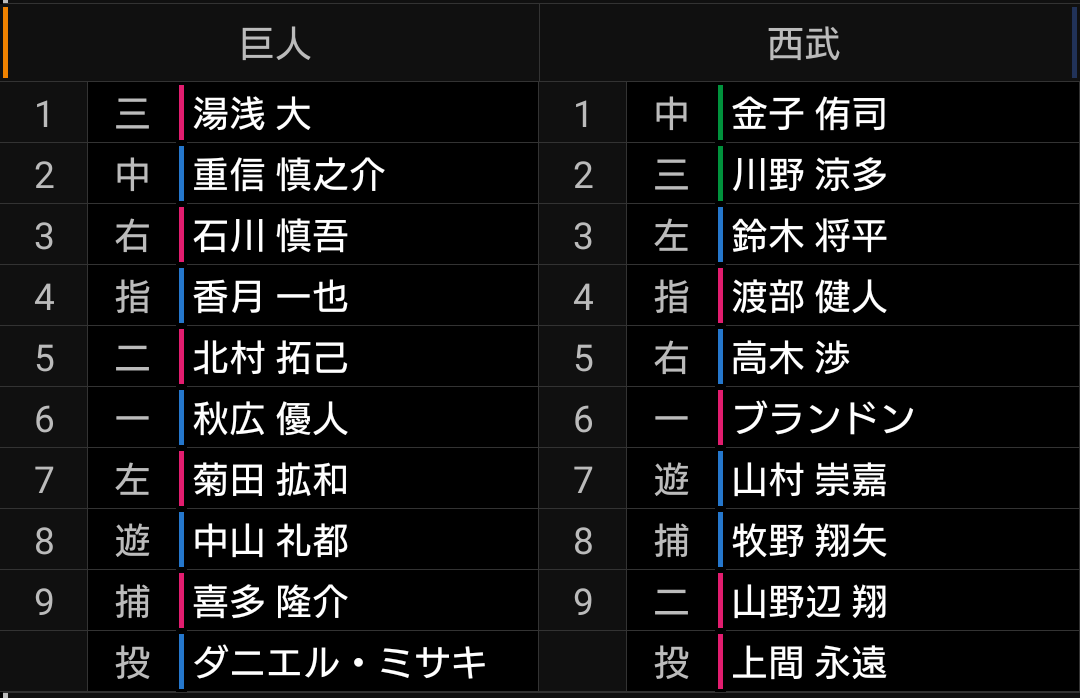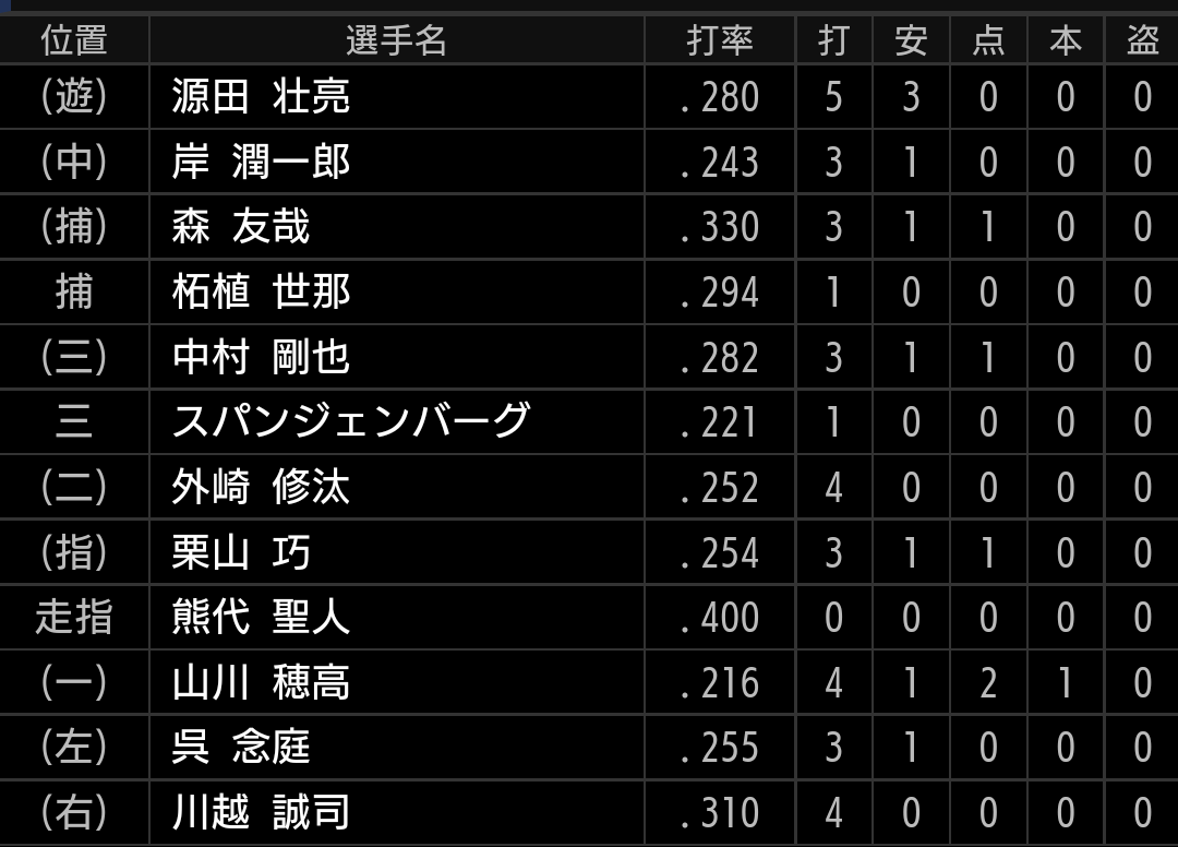 打順を上げても良かったですが、四球も選べる呉の後ろですので、ランナーを置いての長打に期待したいです。【結果】