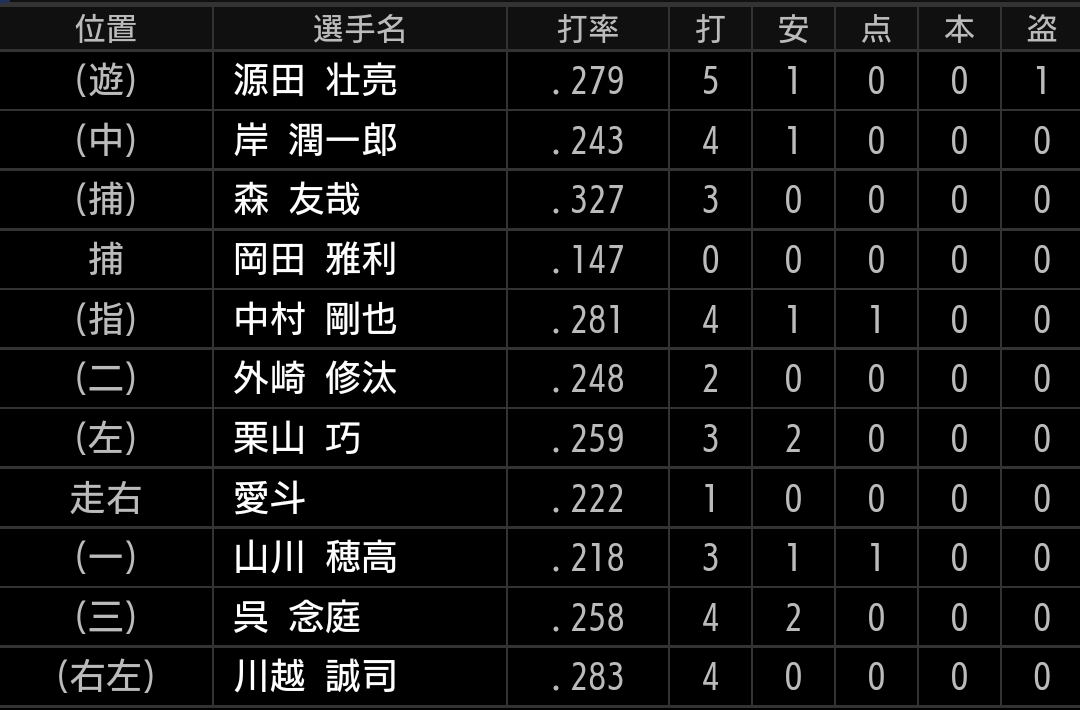 森の調子が良く、山川も四球を選べるようになってきたので、序盤から大差がつかなければもう少し、粘れる打線だとは思います。
