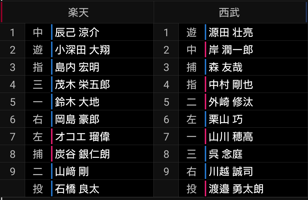 昨日ホームランが出た山川の前ですので、栗山が出れば複数得点のチャンスも生まれます。重要な役割ですので、またここからヒットを積み重ねて行きたいです。ライオンズ打線は一時期の貧打と比べると、最近は上向きに傾向ですので、序盤から攻めていきたいですね。
