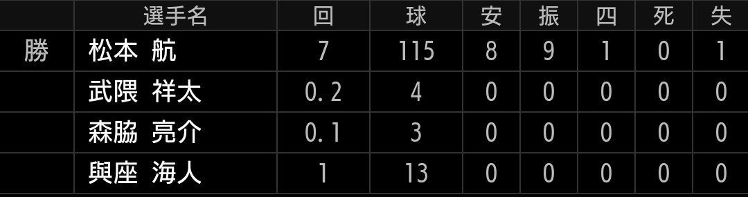 先発松本が7回1失点と好投し、打線は8安打8得点と、効率良く点を取り、8対1で勝利です。
