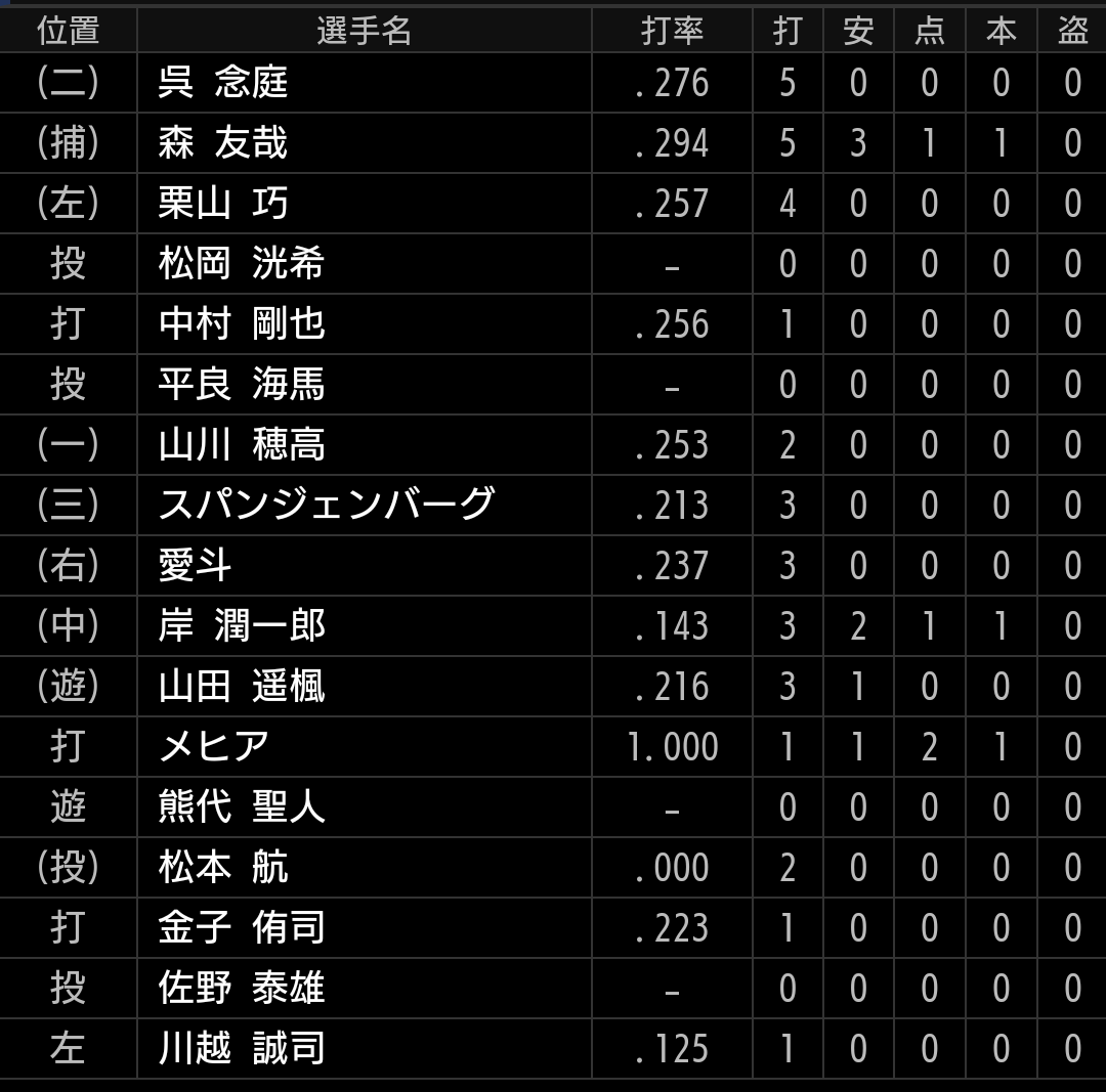 今日は森が奮闘しましたが、栗山、山川の中軸が打たないと厳しいです。