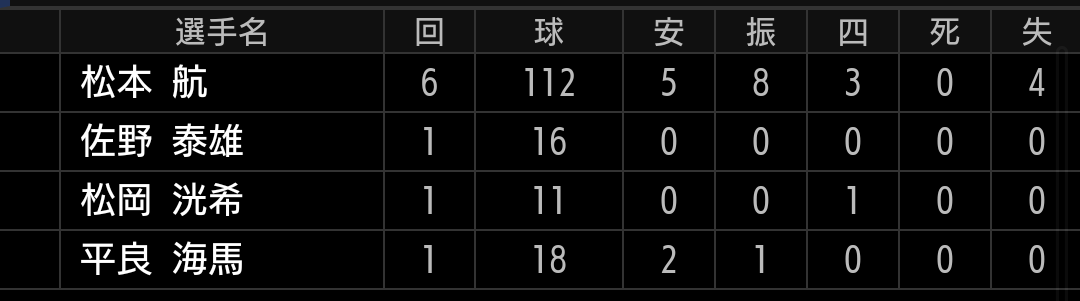 好投が続き、裏ローテの頭に戻りました。松本はストレートが生命線です。バロメーターでもある、アウトローへのスピンの効いたストレートを投げ込めるか注目です。【結果】