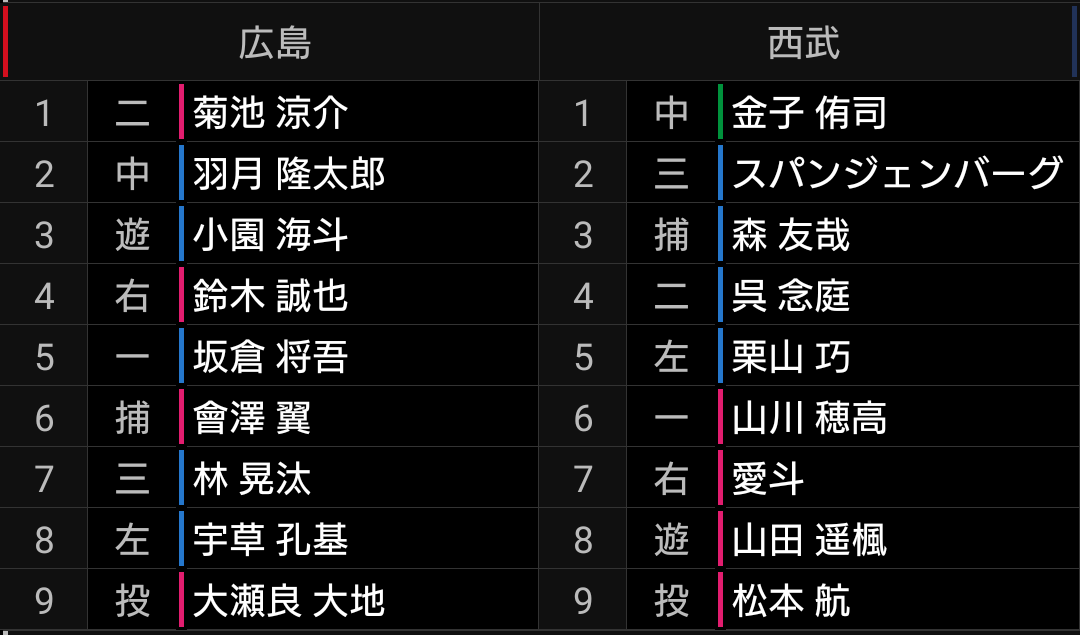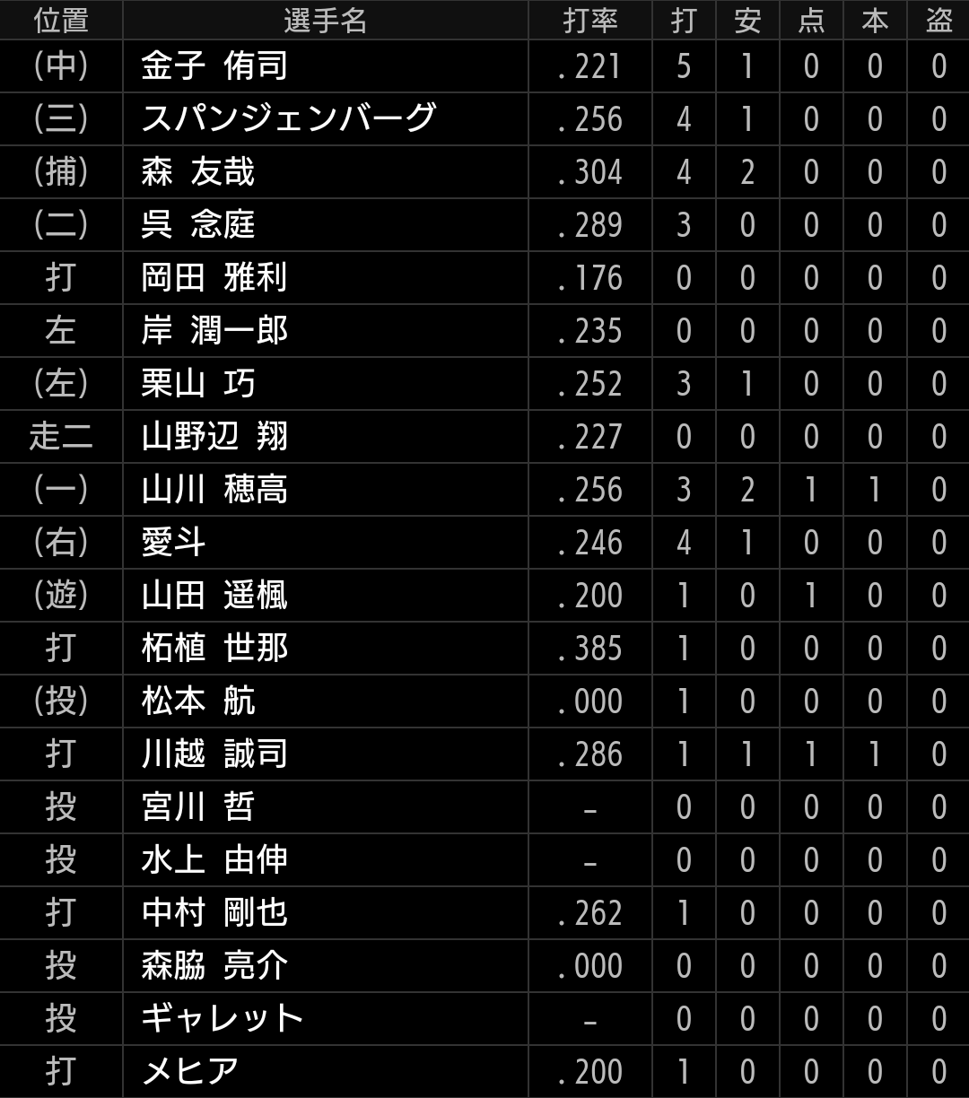 このスタメンなら個人的には、下位は弱くなりますが、上位重視で、スパンジー、森、栗山、呉、山川の並びが良いと思いましたが、金子には奮起を期待したいです。