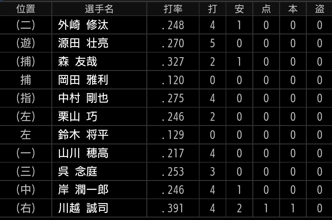 川越がチーム唯一の得点となる、ホームランを含む2安打です。