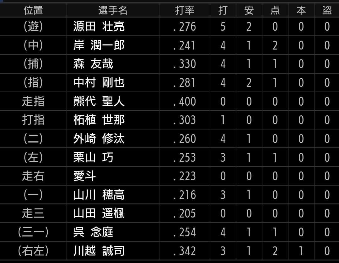 後半戦、好調が続いていた岸ですが、少し打撃が落ち着いて来ました。今日もここまでノーヒットでしたが、意地の一打で先発全員安打達成です。