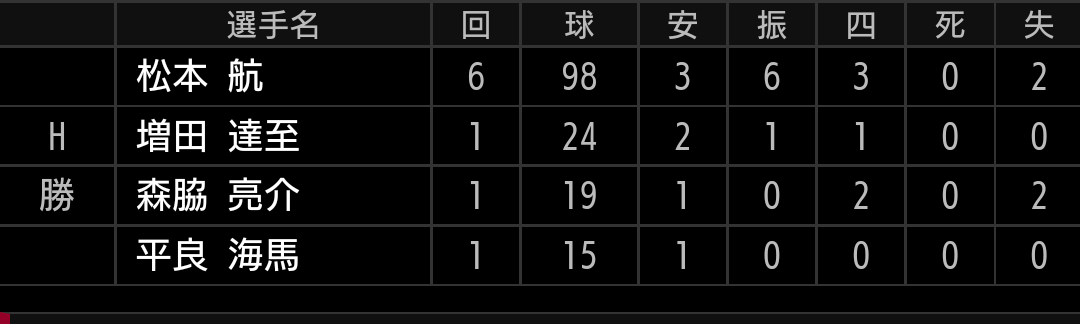 初回に、スリーボールから取りに行ったストレートをタイムリーされますが、そこから立ち直り6回3安打2失点と試合を作りました。今日はストレートに力もあり、松本らしいストレート中心の投球が出来ました。