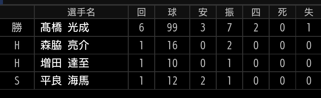 10安打放つも3点と打線は物足りませんが、高橋光成の後を受けた、森脇、増田、平良の勝ちパが復活を感じさせる投球で逃げ切りました。