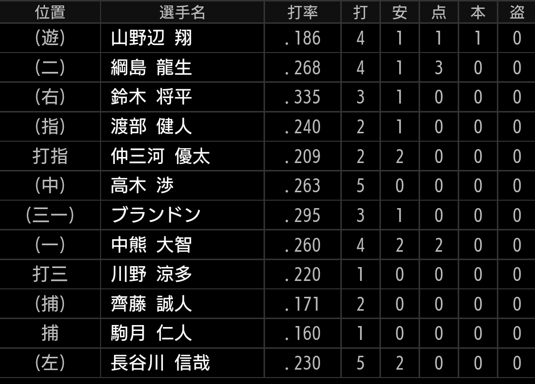 山野辺にホームランが出ています。
