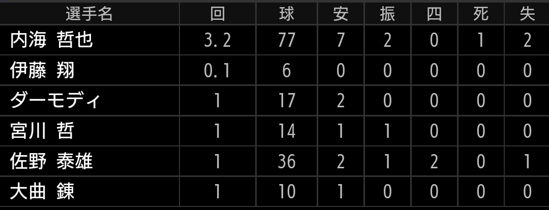 投手陣は、先発内海が序盤で7安打と打たれるも、中継ぎ陣が踏ん張りましたが、7回に登板した佐野が誤算でした。