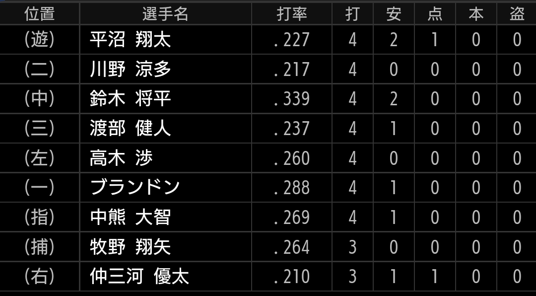ライオンズのファームでは打高投低と、打者の振る力は鍛えられています。平沼もライオンズに移籍して間もないですが、しっかり鍛えて打撃を開花させたいです。【結果】