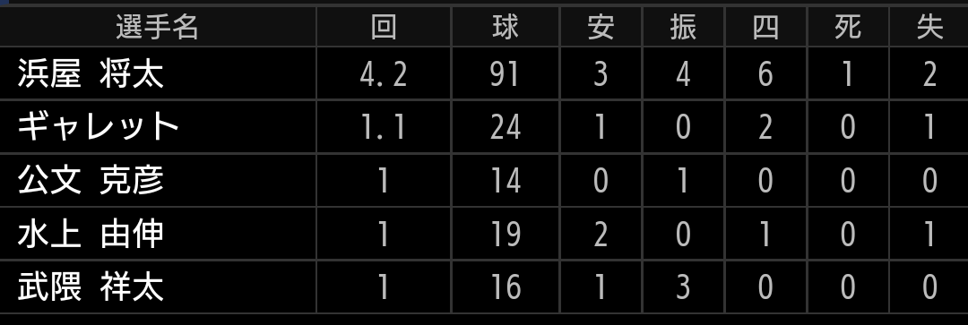 5回途中2失点で降板です。今日は3安打ながら7四死球と、コースを狙うも外して四球という、ゾーン内に投げきれない弱さが出ました。