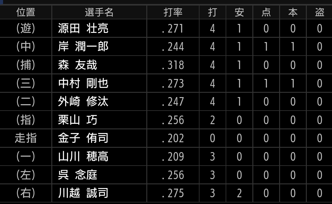 ツーアウトながらホームランが出れば同点の場面で山川でしたが、代走の金子がツーボールから走ってアウトになり、無得点でした。