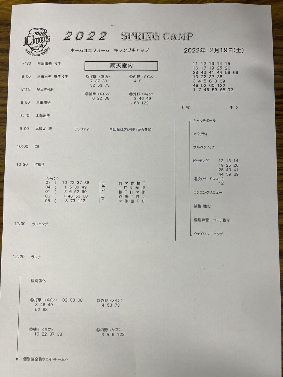 ライオンズは、リハビリ組や実戦登板はまだ早い素材型高卒投手を抱えていますので、投手の駒不足や新外国人の入国遅れにより、少ない戦力で戦います。そのため、このまま怪我やコロナ感染せずに、キャンプを完走してもらいたいです。