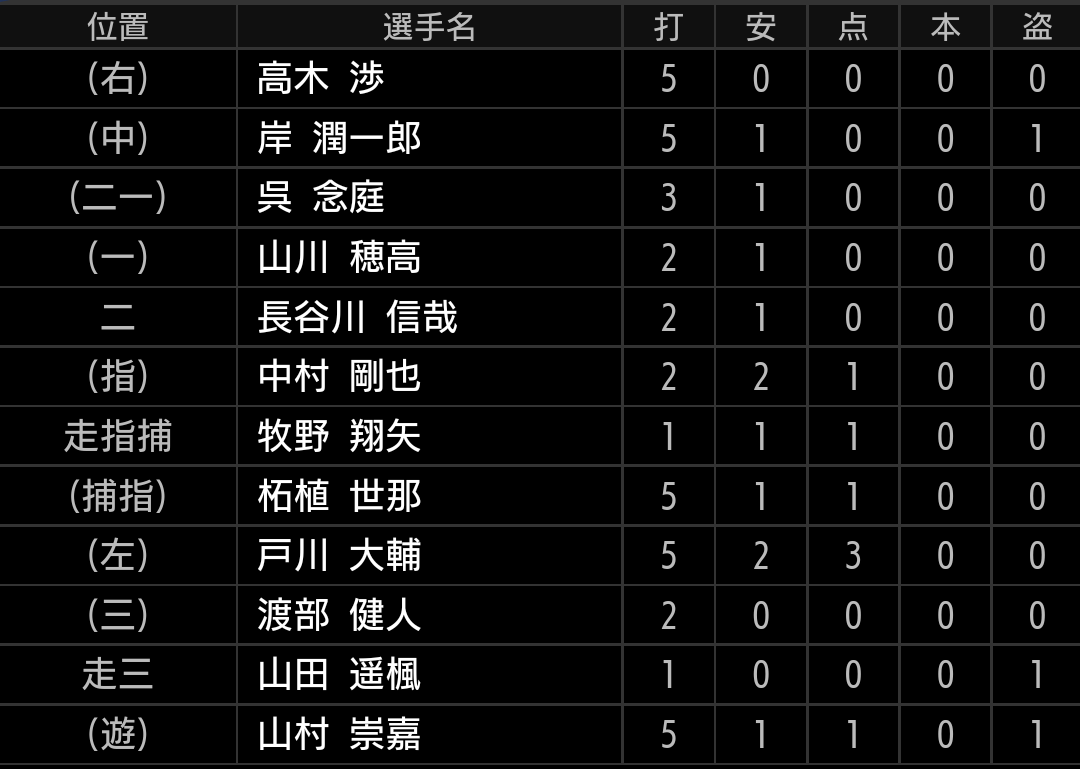 山川、中村以外の野手は、アピール必須の選手たちです。今の所は、主力以外は消去法で選ぶ形になってしまいますので、使いたい選手がたくさんいて困る状況にしてもらいたいです。