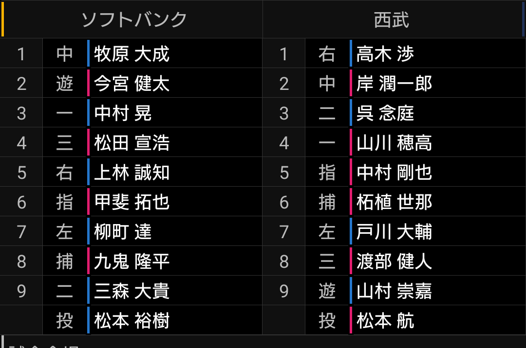 ルーキー山村はショートでスタメンです。昨年のファームを見る限り、まだショート守備は厳しいですが、育成前提での起用ですので、打力でアピールしてもらいたいです。