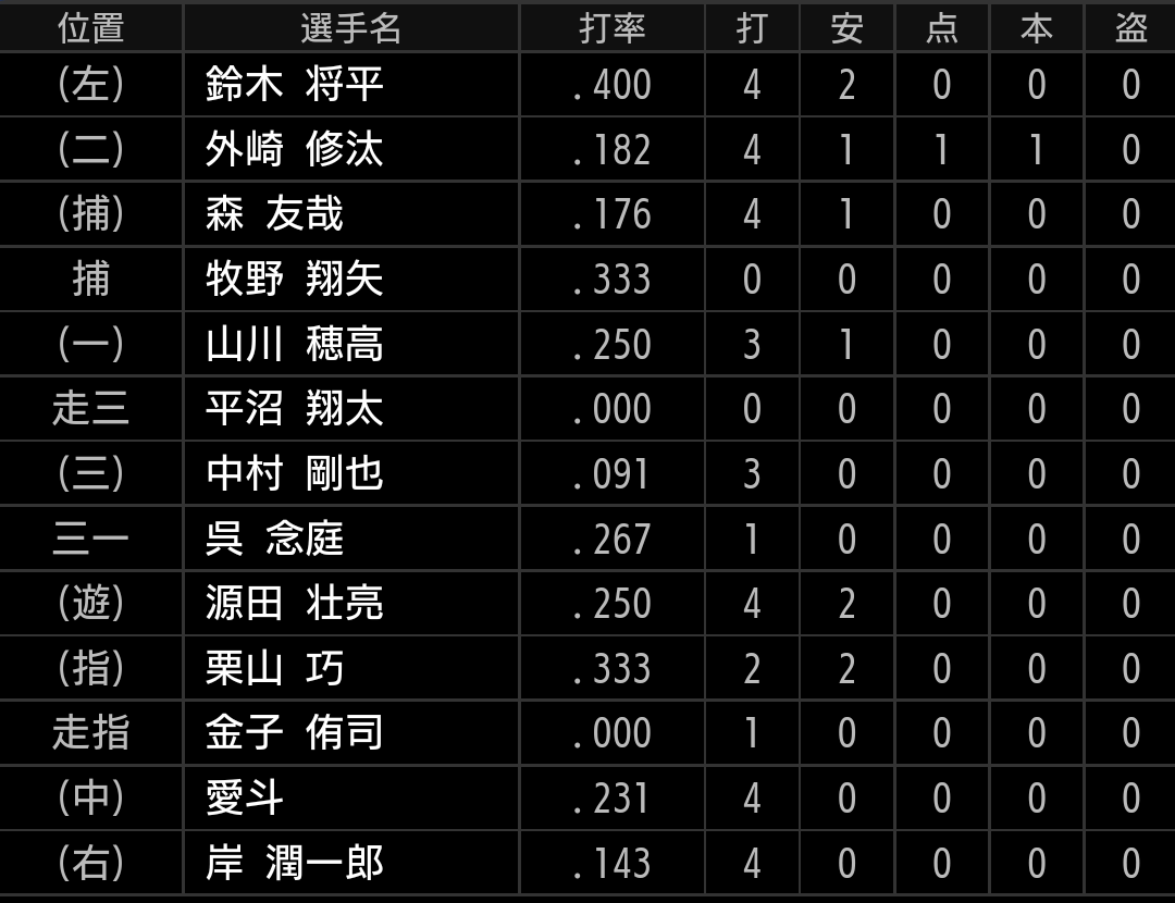 ここまで好調だと、開幕時に失速しないか心配になりますが、レギュラーではない選手にとっては、まずはオープン戦で結果を出さないと、使ってもらえないので、この調子で良いと思います。ただ、怪我だけは気をつけたいです。源田、栗山選手も2安打です。栗山選手は四球も合わせて、全打席出塁です。