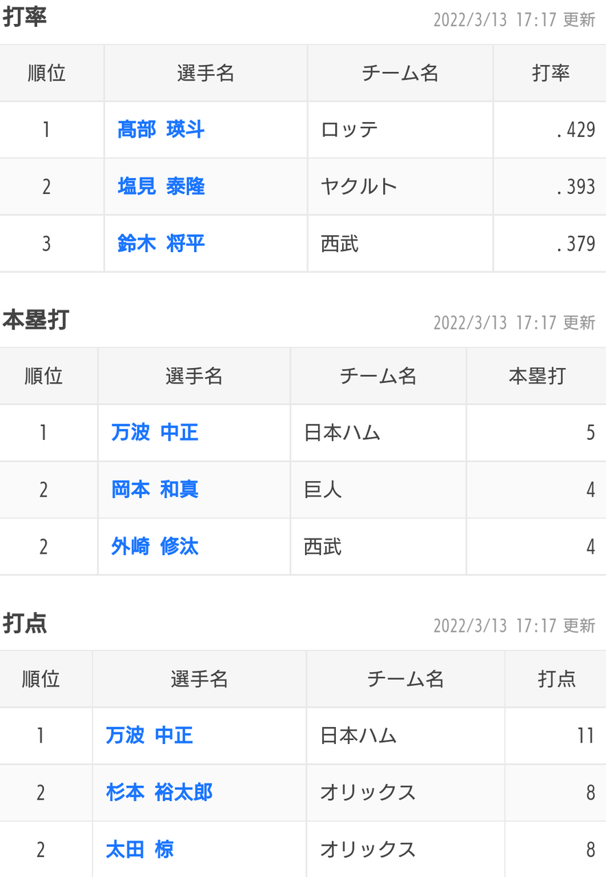 オープン戦好調の日ハムは、万波選手が長打力を発揮しています。粗さはありますが一発がありますので、シーズンでは長打警戒です。