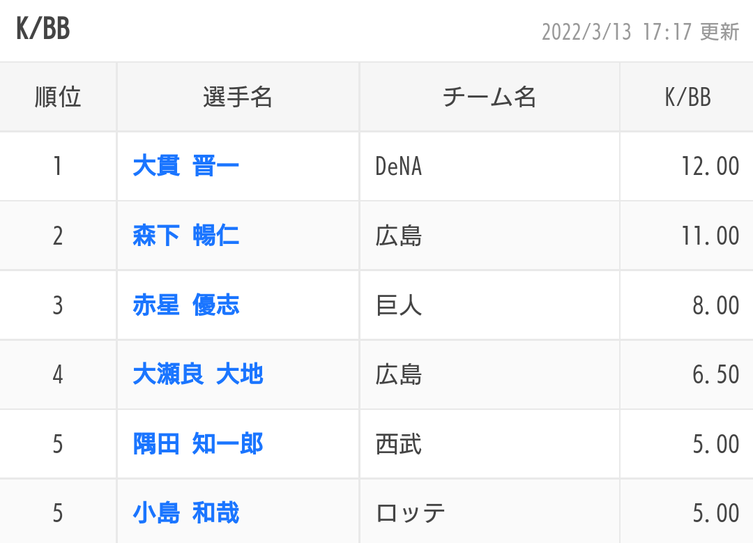 制球が良く空振りも取れる隅田投手が、K/BB5.00とランクインです。