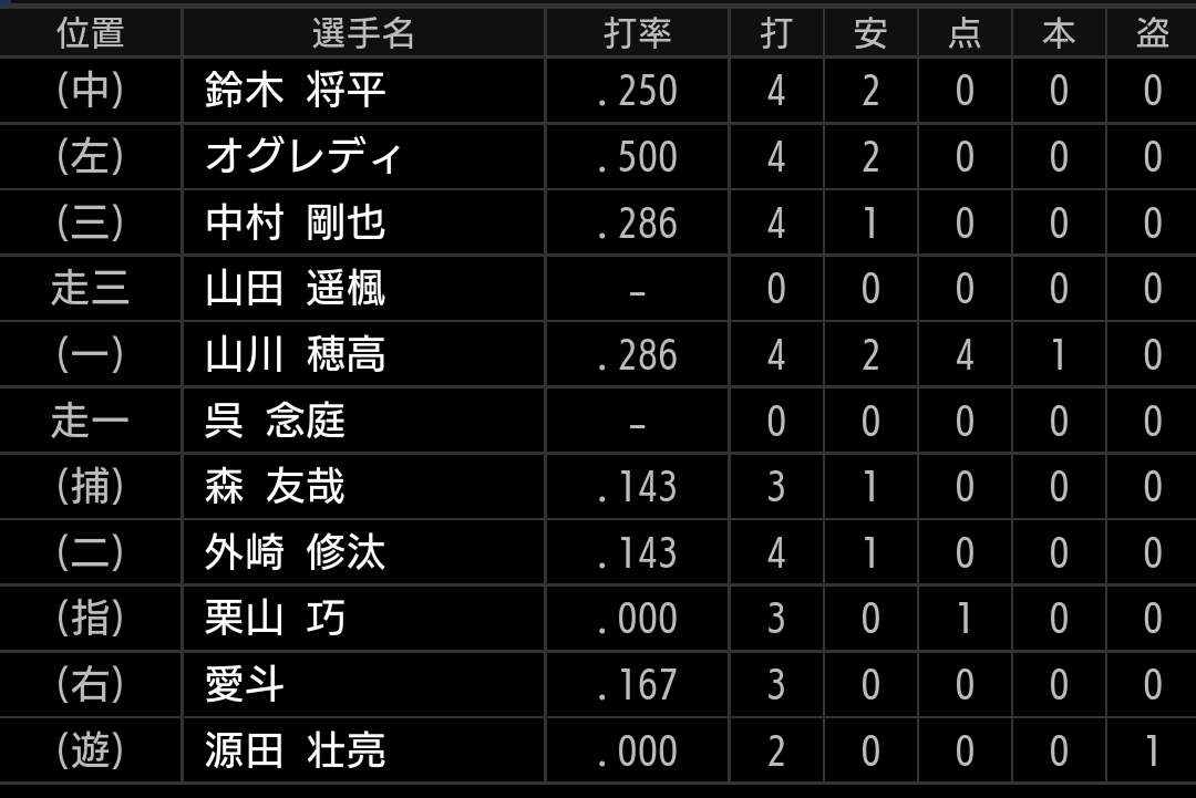 鈴木、オグレディ選手の新1、2番が、共に2安打です。