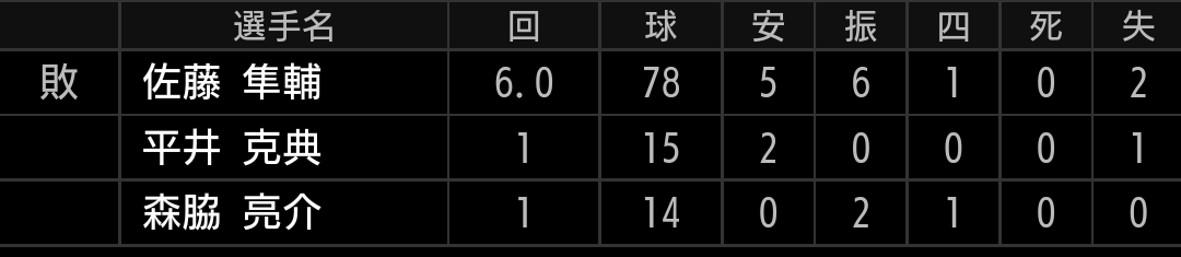 隅田投手に続いて、佐藤投手も見殺しにしてしまいました。ルーキーには厳しい展開でしたが、今後も期待出来る投球だったと思います。