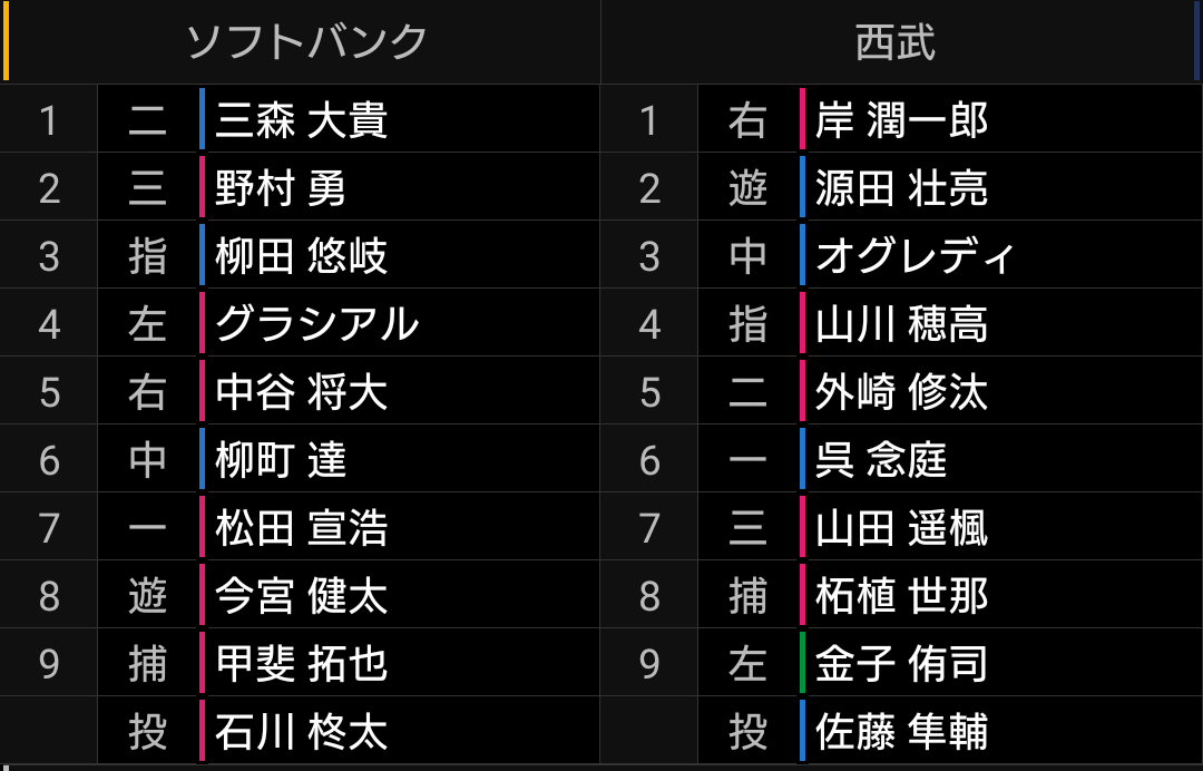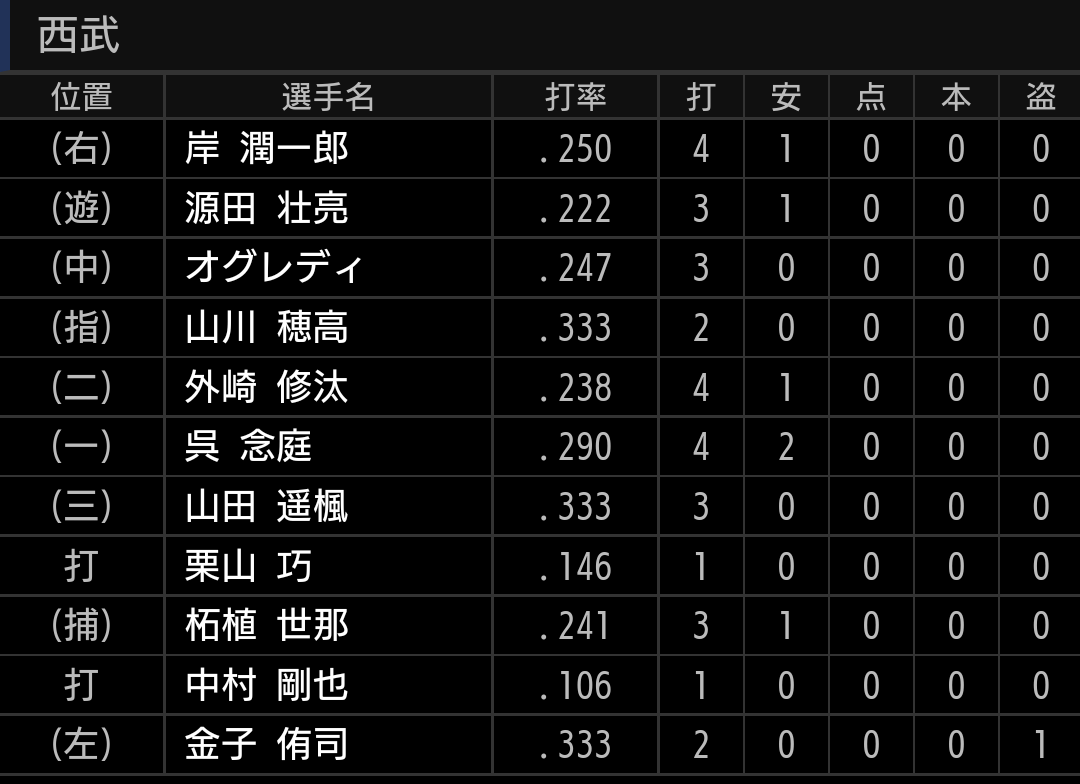 結局今年も1番が穴になっています。好調な下位打線を崩したくないというのもあると思いますが、それでもやはり、打席の多く回る上位は調子の良い選手を起用したいです。個人的には、今なら外崎選手をトップにして、外崎、源田、オグレディ、山川と打線を組みたいです。5番以降は最近勝負強いですし呉、山田、柘植選手を繰り上げるでも良いと思います。ただ、トップに起用された岸選手は、せっかく起用してもらったので、良いところを見せたいです。