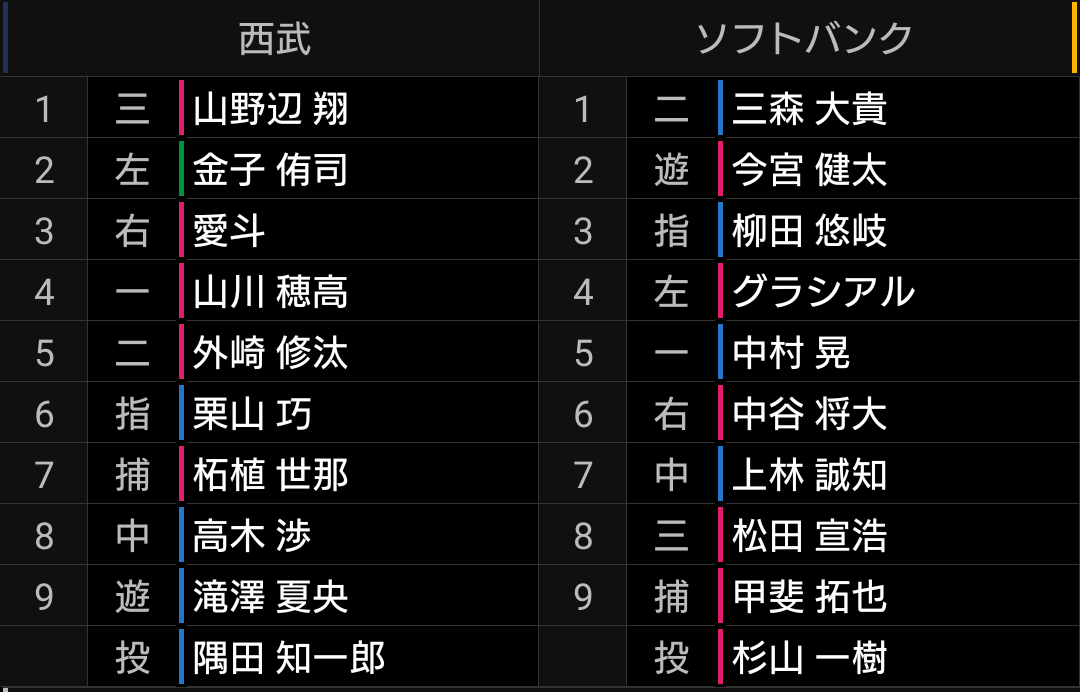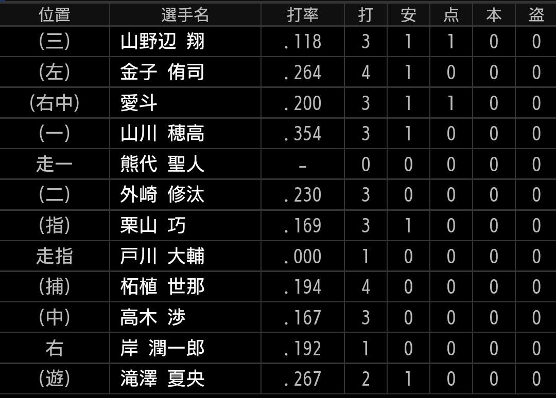 離脱者も多いのでしょうがないですが、駒不足感は否めません。山野辺、金子、愛斗選手で何とか出塁して、山川選手の長打に期待をしたいです。山野辺選手は試合前に辻監督からマンツーマン指導を受けていました。