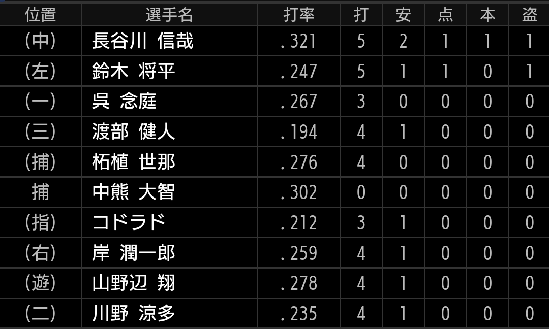 選球眼の良さは健在ですので、後は長打が欲しい所です。強い打球を外野に飛ばせるようにしていきたいです。鈴木選手は1安打です。