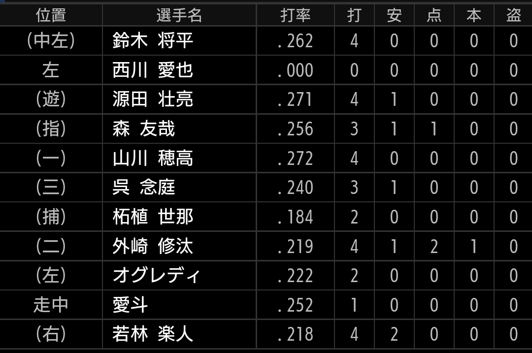 外崎、源田選手の1、2番が機能していないため、比較的振れている鈴木選手を抜擢です。鈴木選手が出塁し、同じく打撃が上がってきた森選手に回したい打線となります。なかなか点が入りませんが、基本的にはディフェンス力で勝っていくチームですので、攻撃は粘っこく、守備はシンプルで良いので堅実に行きたいです。