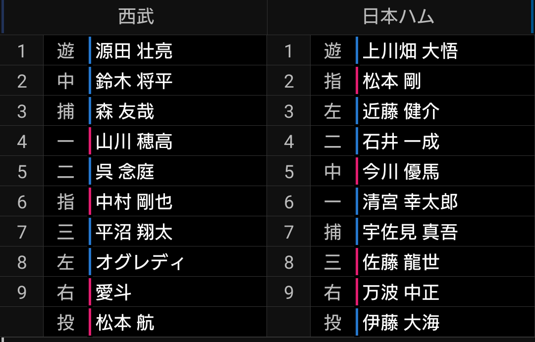 初回、鈴木選手の2ベースでチャンスを作るも、森、山川選手が凡退。3回は、オグレディ選手四球から手堅くバントで送りますが、源田、鈴木選手が倒れて無得点と、得点のチャンスを逃しました。3回までは打てなくても球数も稼ぐ粘りを見せていましたが、4回以降はいつもの淡白な打線となり、そこからは凡打の山を築き得点の取れる気配もなく淡々と進みました。