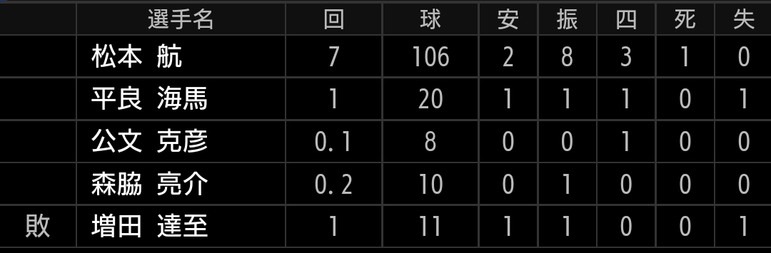 今日は制球があまり良くなく、高めのスライダーは清宮選手にあわやの当たりも打たれました。1アウトは取りましたが、宇佐美選手に四球を出して交代です。森脇