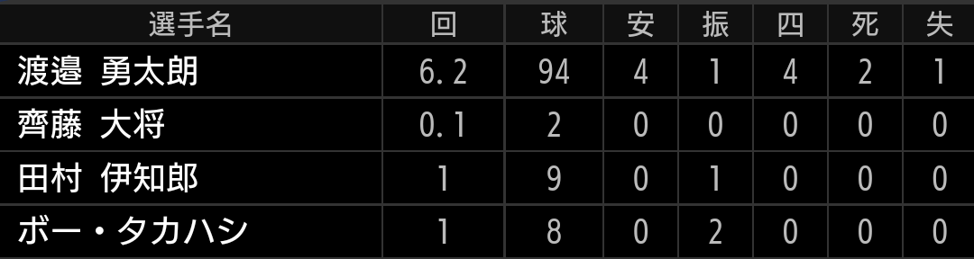 7回途中4安打1失点の好投です。球速こそ140前半でしたが、カットを使いながら打たせて抑える投球でした。