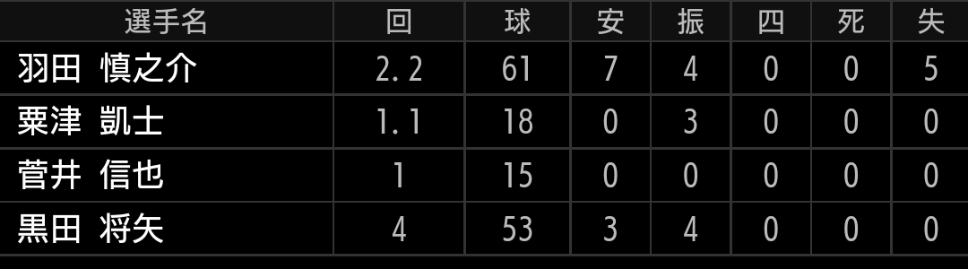 先発羽田投手が5失点となりましたが、リリーフした粟津、菅井、黒田投手は無失点で抑えました。