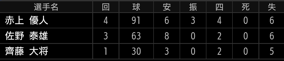 3イニング6失点の炎上です。ストレートも140キロを切っていましたし、制球も良くなかったです。昨年ファームに落ちてから球威が戻りません。キャリア的にも、時期的にもちょっと厳しくなりました。