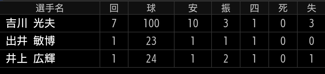 ライオンズ先発の吉川は、10安打されますが3失点にとどめて、試合を作りました。