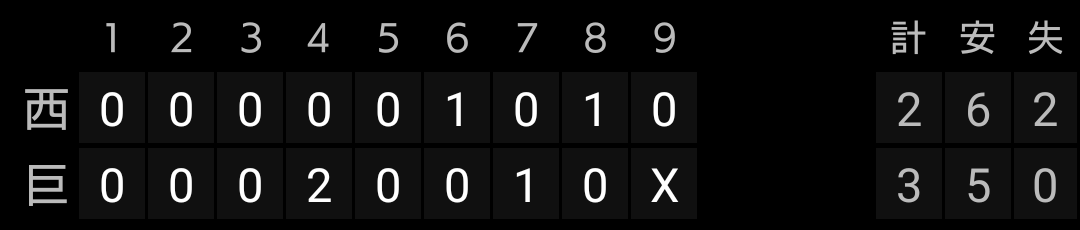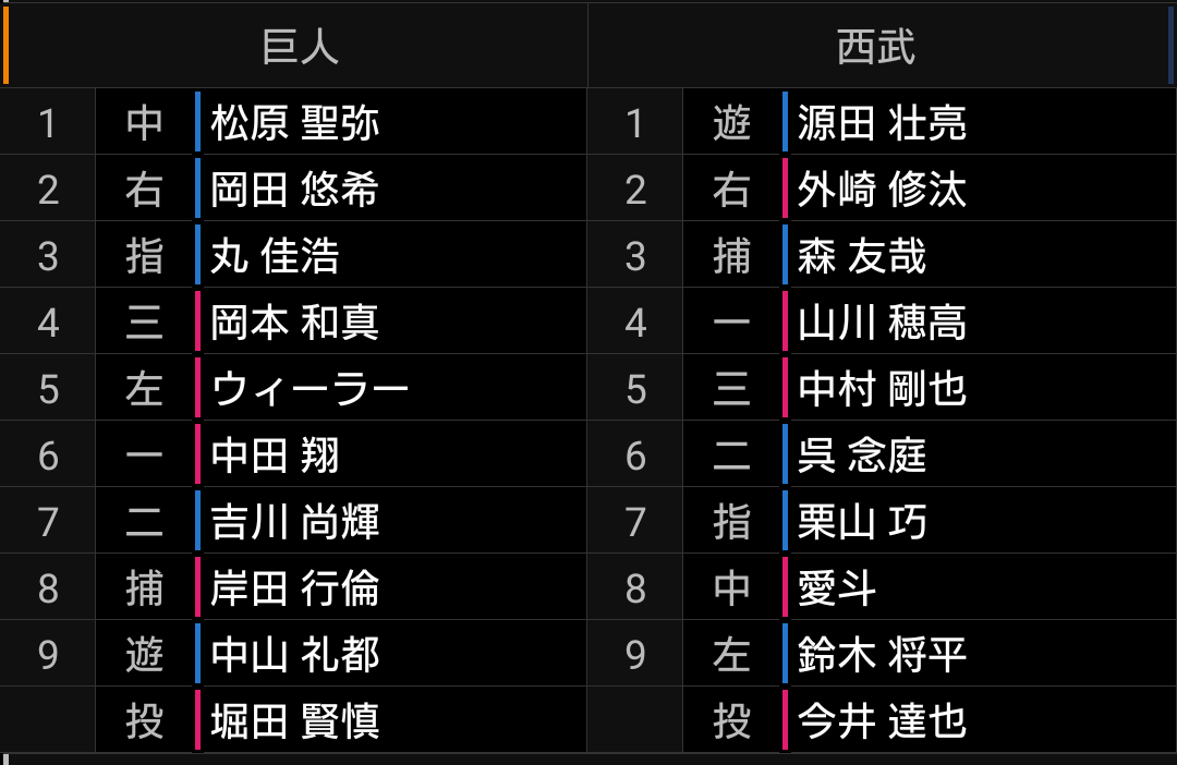 巨人岡本、中田のホームランで3点取られ、山川、呉のタイムリーで追い上げましたが、届きませんでした。