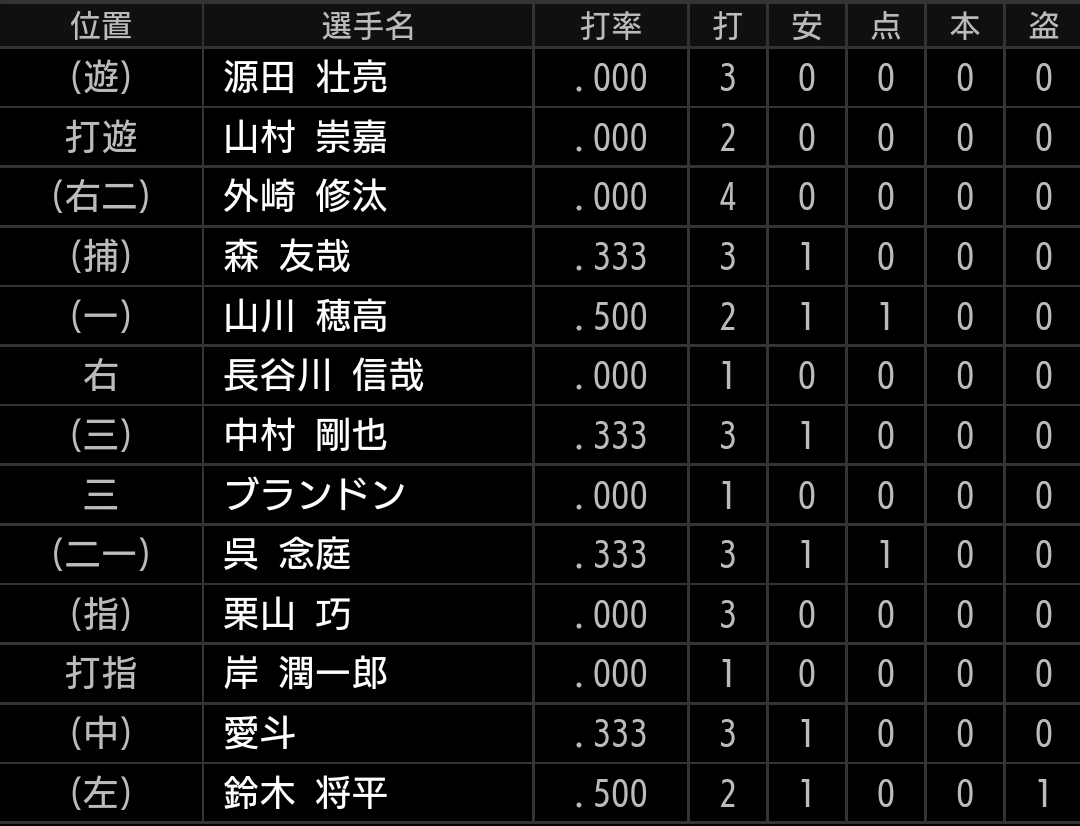 立ち上がりから連続四球で苦しんでいた投手相手でしたが三球三振と、スライダー、フォークにバットが当たりませんでした。主力では、調整遅れの外崎選手の状態が上がりません。