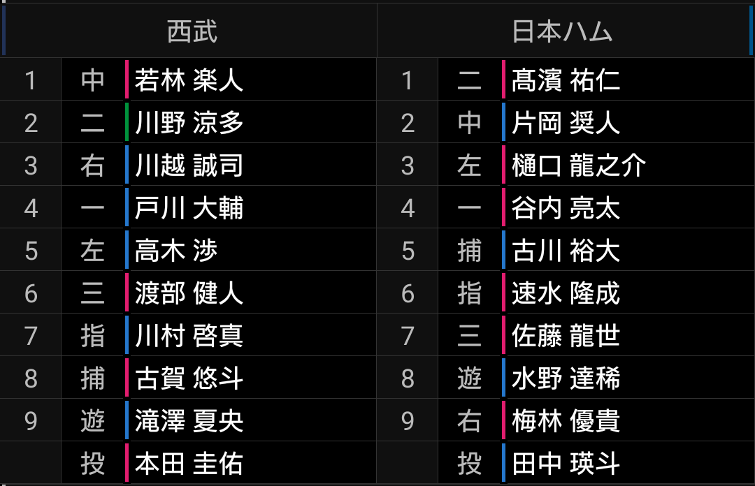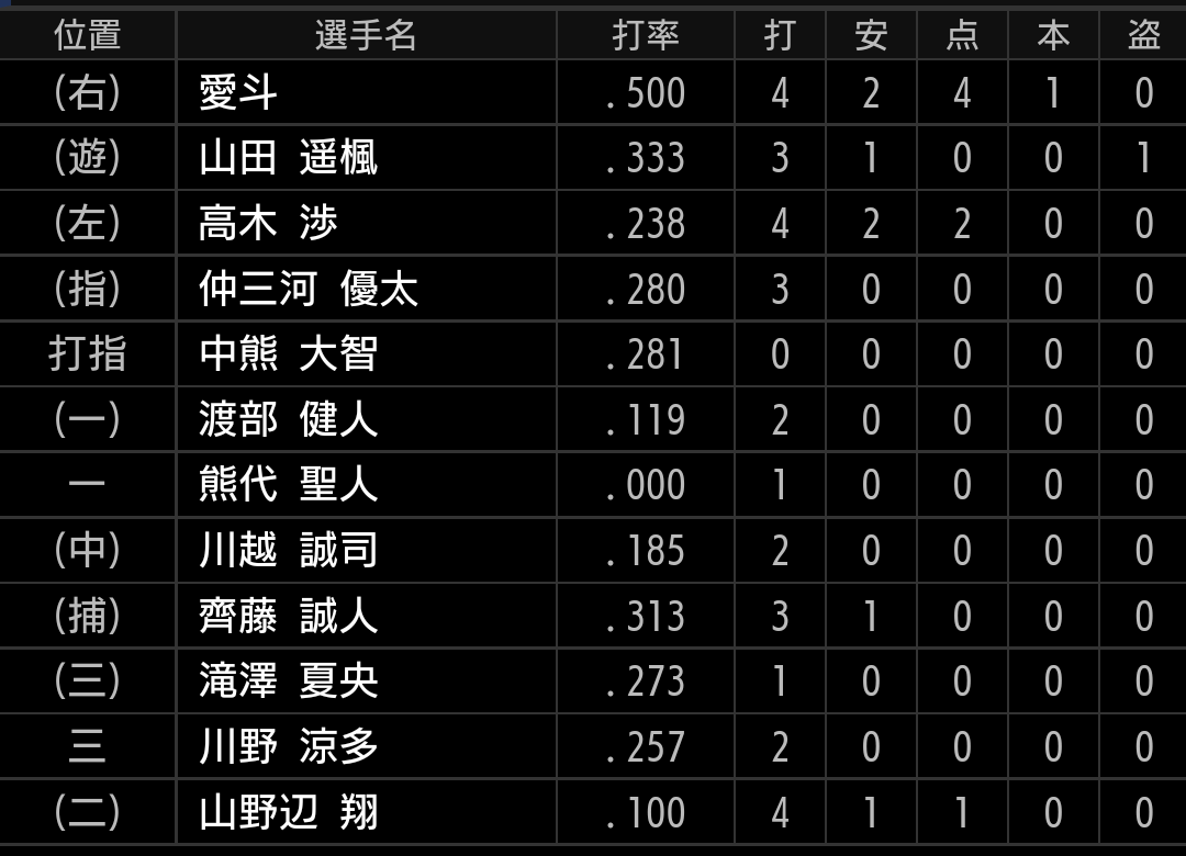 愛斗、山田、斎藤、山野辺選手の1軍メンバーも出場です。1軍は6連敗中と苦しい状況ですが、控えを含めた全員が戦力になるためにも、試合勘は戻してもらいたいです。【結果】