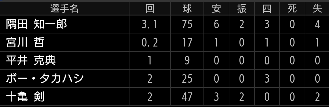 敗戦処理にボー投手、森脇投手、ロングリリーフに與座投手、十亀投手を待機させて、平井、宮川、水上投手を使わずに直接平良投手に繋ぐ試合も作りたいです。