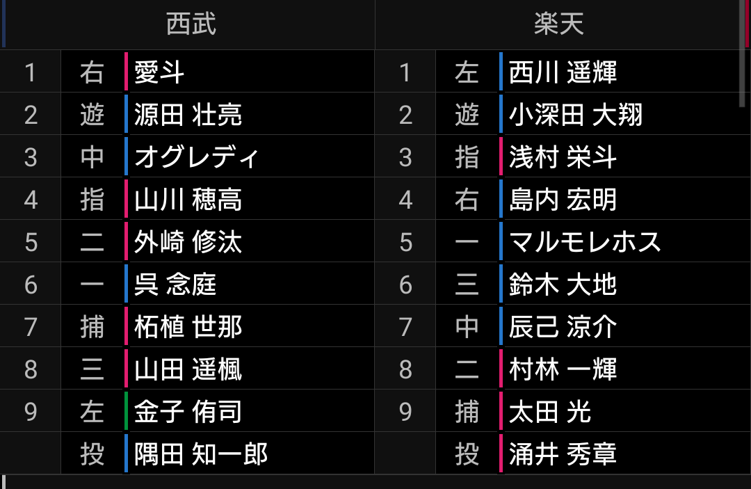 明日からは6連戦になるため、先発が6人必要になります。詳細はまだ出ていませんが、今井投手がファーム登板中にアクシデントにより降板したため、明日からは、スミスー松本ー佐藤ー髙橋光成ー隅田ーエンスというローテになる予想です。