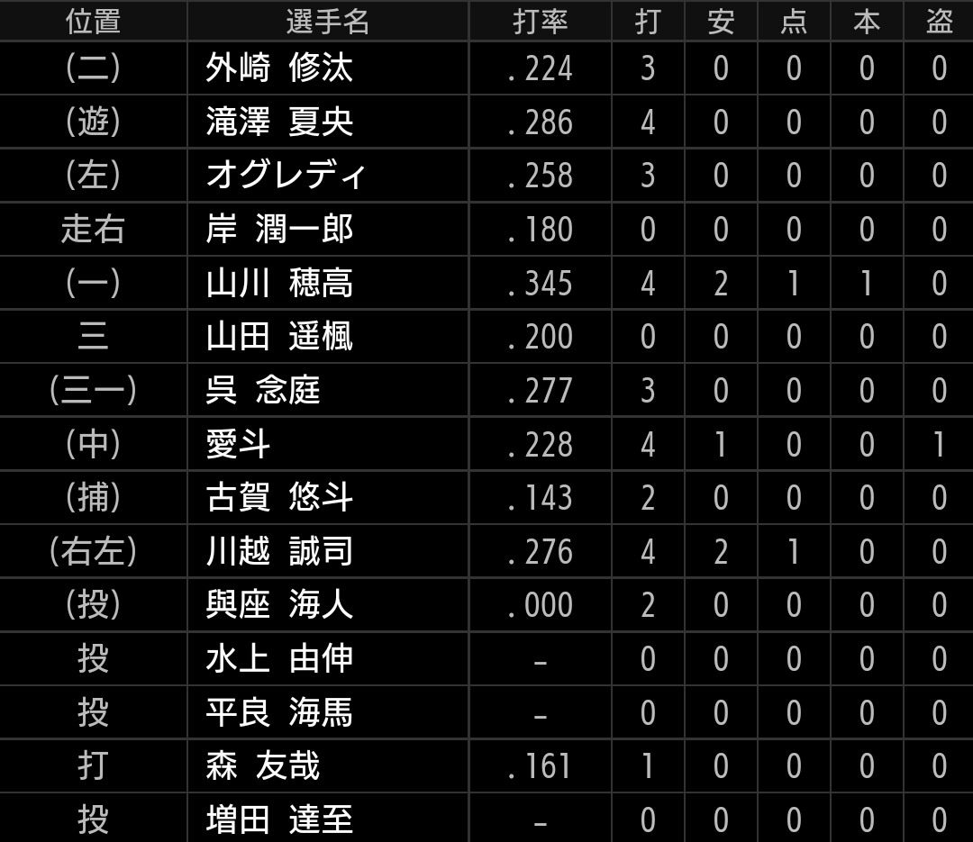 川野選手はコロナからの復帰です。源田選手離脱後、代わりにショートを守りたかったですが、タイミング悪くコロナで不在でした。現在は滝澤選手が1軍ショートを守っていますが、チャンスはあると思いますので、アピールしたいです。