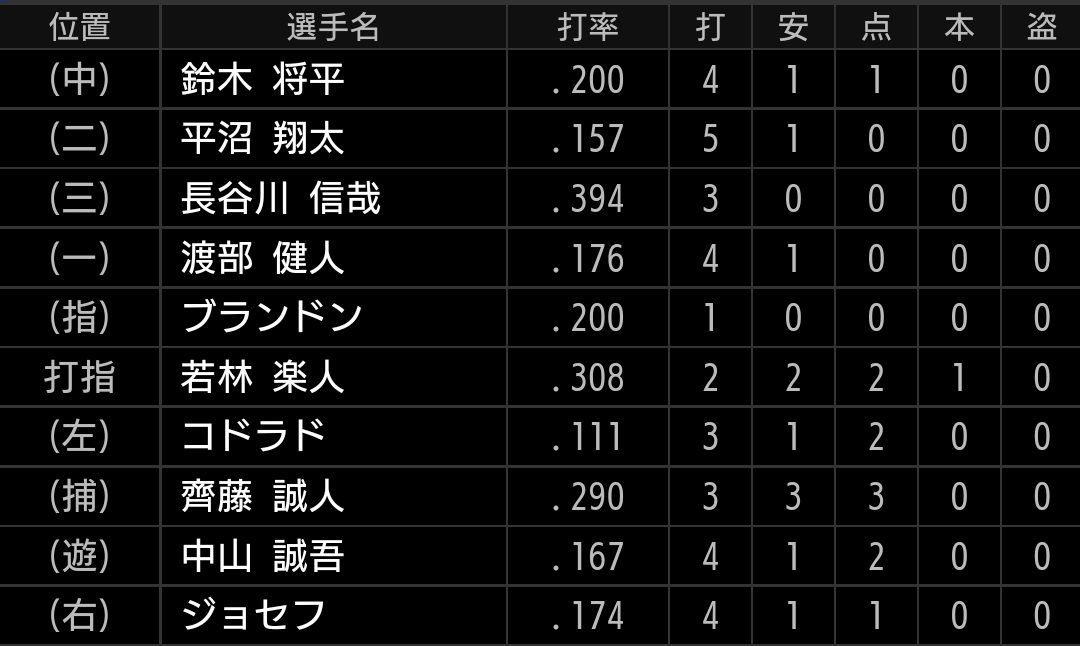 ロッテ投手陣に抑えられていましたが、9回に反撃し1点差まで迫りましたが、届かずに敗戦です。