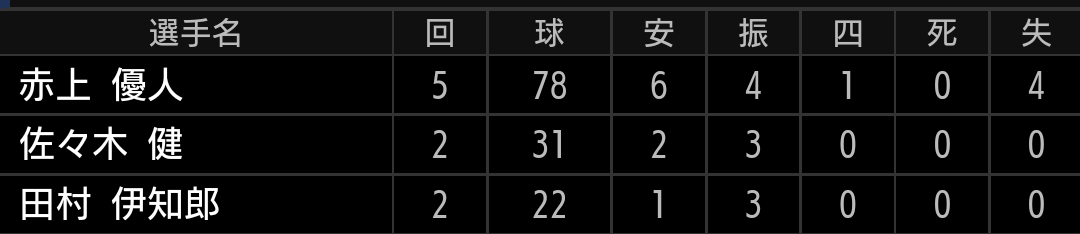 5イニング78球投げました。初先発でしたが、5回4失点は十分な投球でした。5回は球速が140前半まで落ちましたが、それまでは140後半の球速は出ていました。ストレートが抜ける事もありましたが、四球1つだったのは良かった所です。