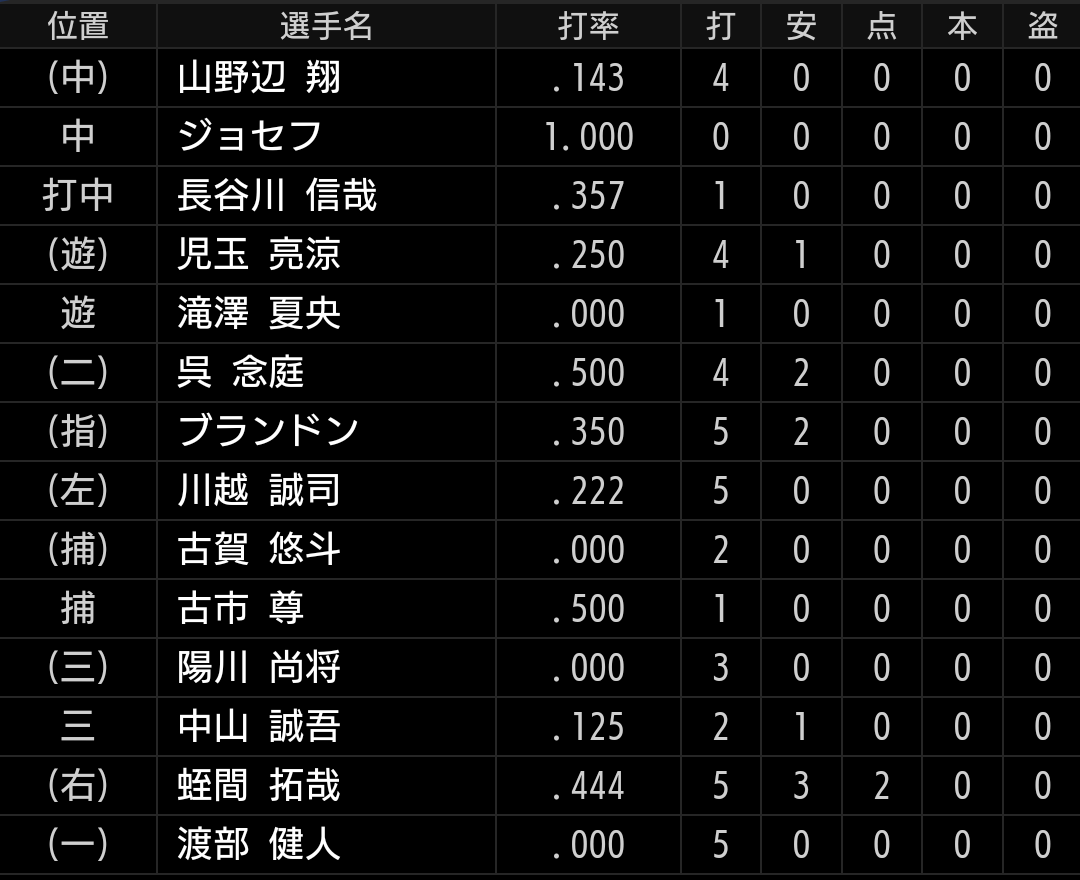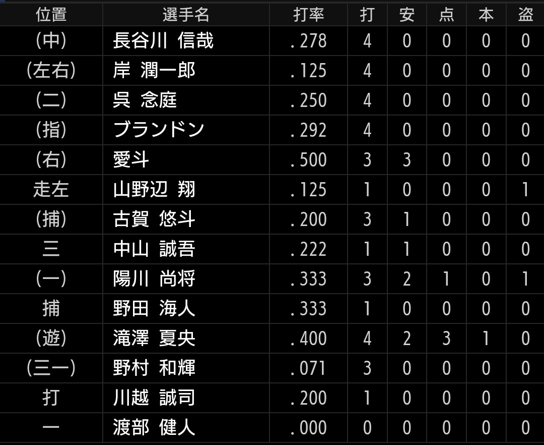 愛斗、呉、ブランドン、蛭間選手辺りが覚醒し、2ベースを量産するような打撃を見せてくれれば得点力もアップします。