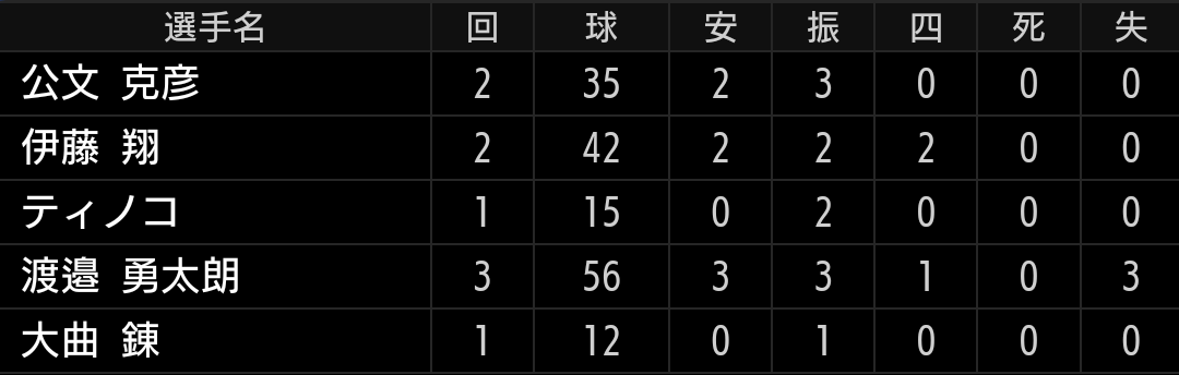 ツーシームを打たれて満塁となりますが、連続三振で切り抜けました。スライダーは変わらず決め球となっていますが、ツーシームが真ん中付近に入り打たれています。大曲