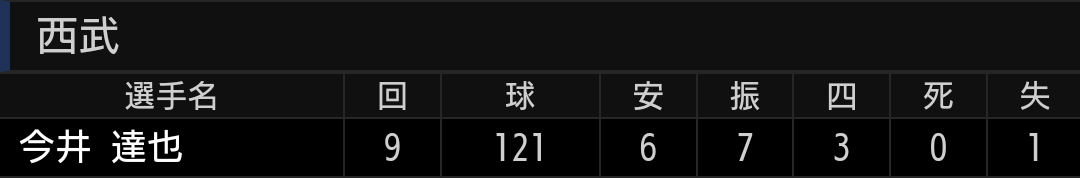 エース髙橋光成投手が抹消となりましたが、それならばと今井達也投手がエース級の役割を果たす、素晴らしい投球でした。