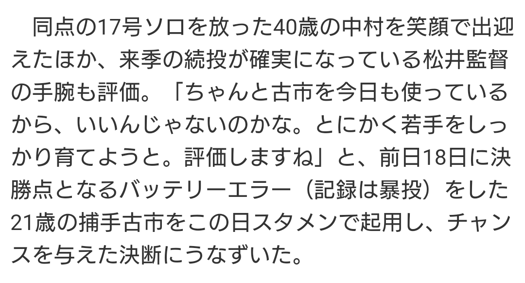 他球団に取られないように、早めに来季の契約をまとめてもらいたいです。