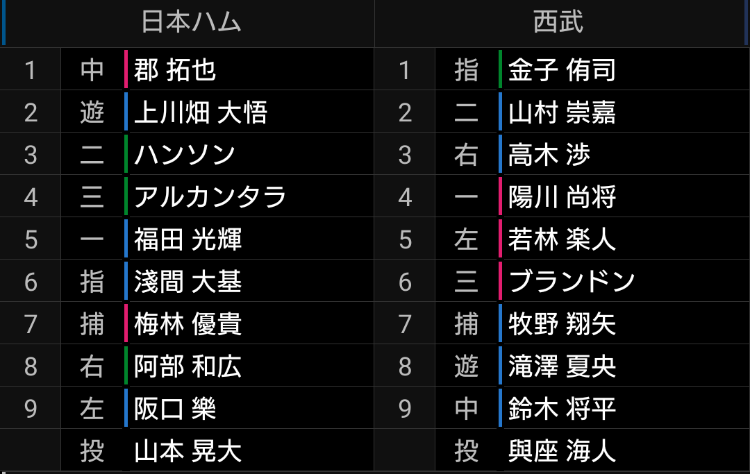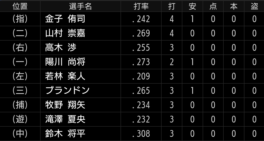 色々試すのは良いと思います。ただ、打順や守備を入れ替えた程度で戦力不足には変わりません。また、こう見るとやはり外野の弱さが目立ちます。佐藤龍選手が外野を守れれば良いのですが。。。