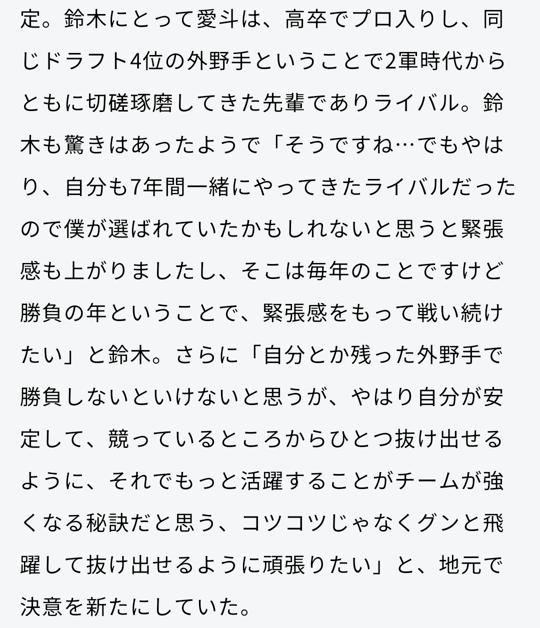 今季は、三振率を低下させたとは言えホームランが減ってしまいましたので、飛距離は維持したまま三振率を抑える取り組みをし球団へアピールしたいです。