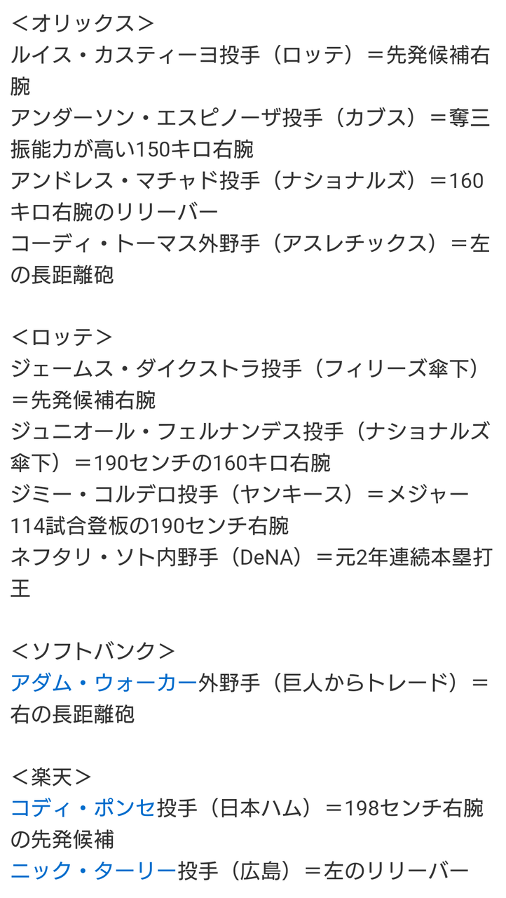昨季上位4球団の支配下新外国人選 手は、以下の通りです。